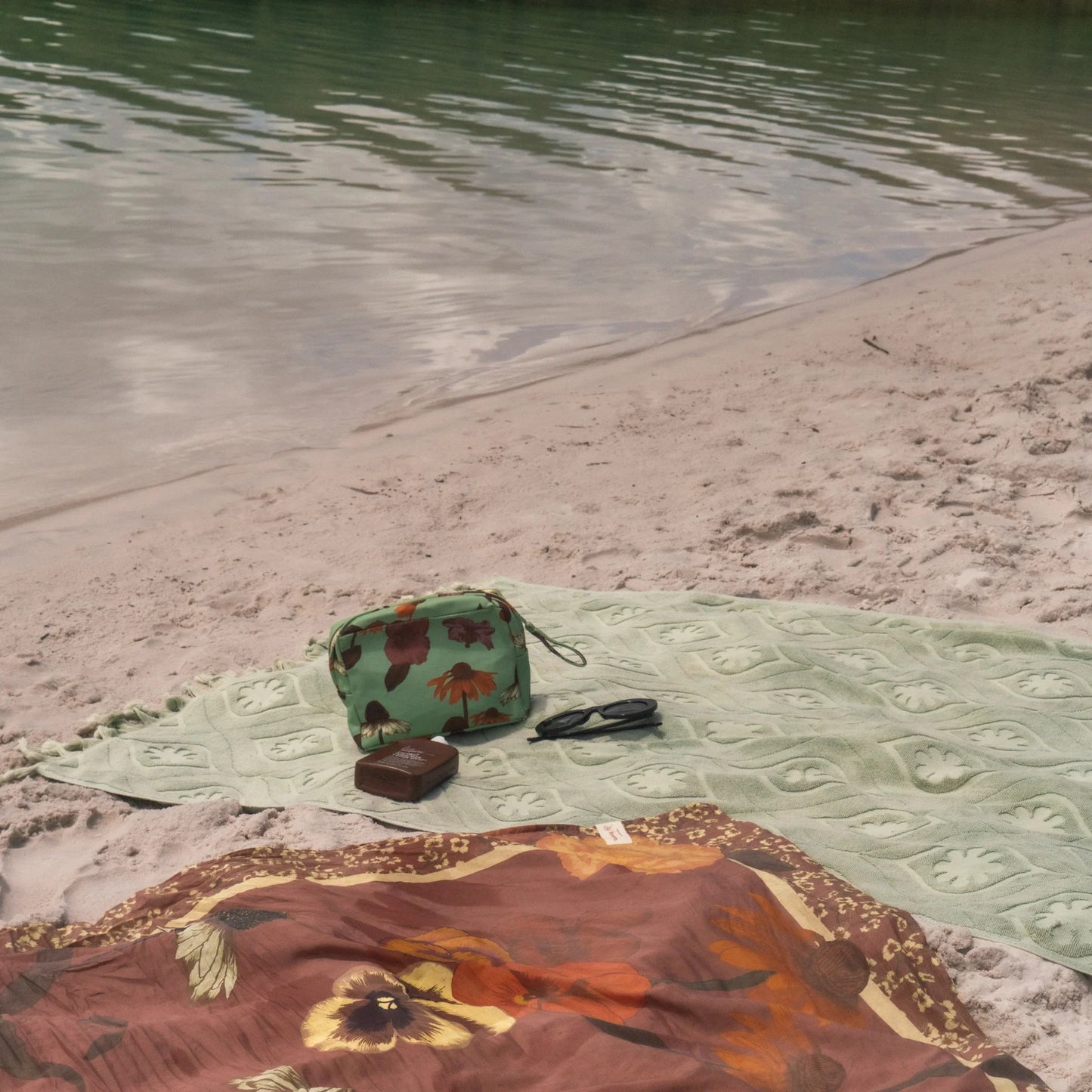 A new addition to our Beach collection this summer! This handy and versatile zip bag makes storing your sunscreen easy for a day at the beach. Pairs perfectly with the other pieces in the collection. Featuring our hand-drawn floral print and a large loop on zip end to make for easy caring.