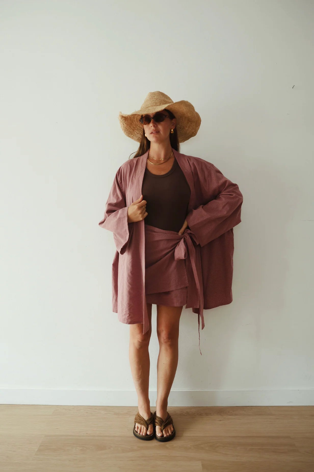 A little bit holiday, a little bit everyday. Made from 100% cotton, this sarong-style mini features a soft elastic waistband and a front tie for easy wrap-and-go styling. The pink check brings a hit of colour, while the lightweight drape keeps it breezy and versatile. Wear it with the Luella Kimono or throw it over swim — either way, it’s a no-thought styling win.