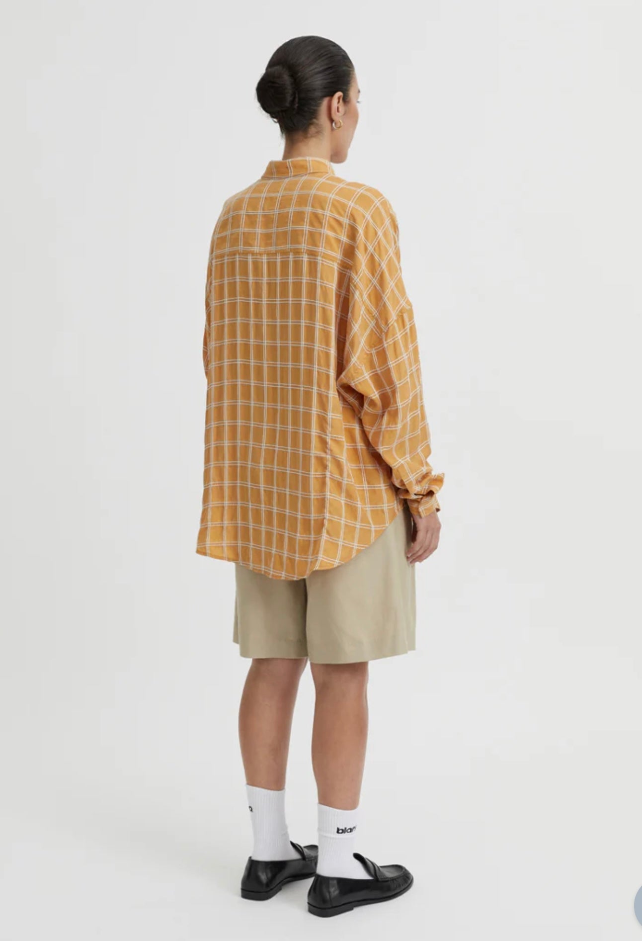 The Tommy Shirt in Mustard is a refined take on everyday shirting, designed to bring elevated ease to your wardrobe. This oversized silhouette offers a balance of structure and softness with its dropped shoulders, button-through front, and classic collar. Perfectly tailored at the cuffs and designed with a subtle high-low hem, it lends itself effortlessly to relaxed styling. Wear it tucked into trousers, layered under blazers or tied at the waist.