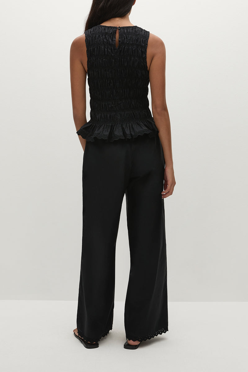 A sleeveless top with a high rounded neckline and keyhole button closure at the back neck. Shirred through the bodice, it features a gathered peplum hem with a vintage lace trim finish. Designed from a classic black cotton, it is the perfect feminine addition to your vacation wardrobe when styled with the matching Ruth Skirt.