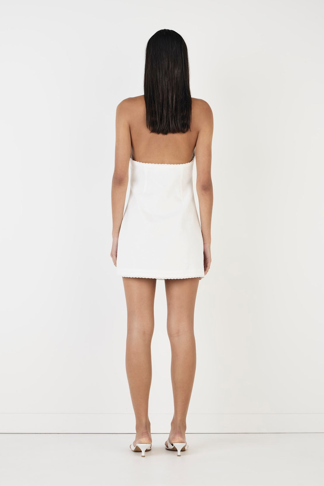 The Marissa Mini Dress is a halter wrap-style mini dress with a centre front keyhole and collar. Features a low scoop back, asymmetrical front button wrap detail, and is fully lined for comfort and coverage.