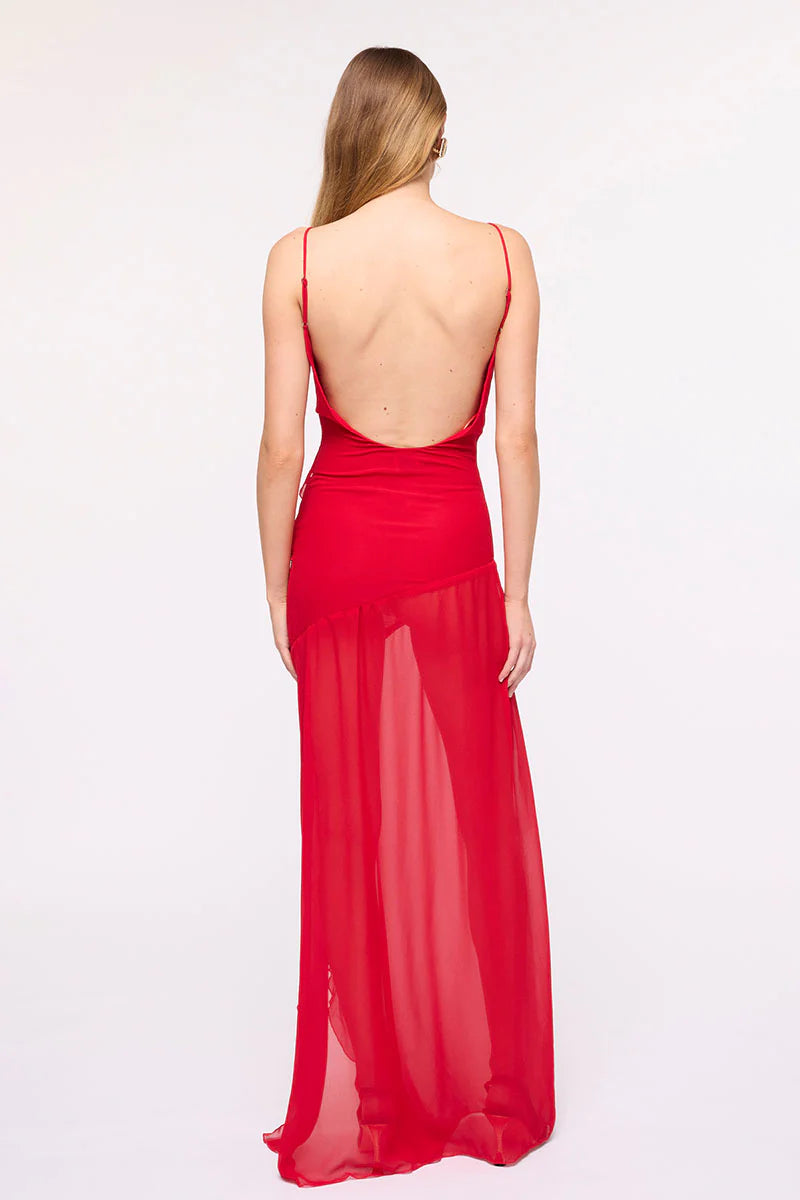 The Isabel Frill Maxi Dress – Cherry Red embodies modern romance and confidence.