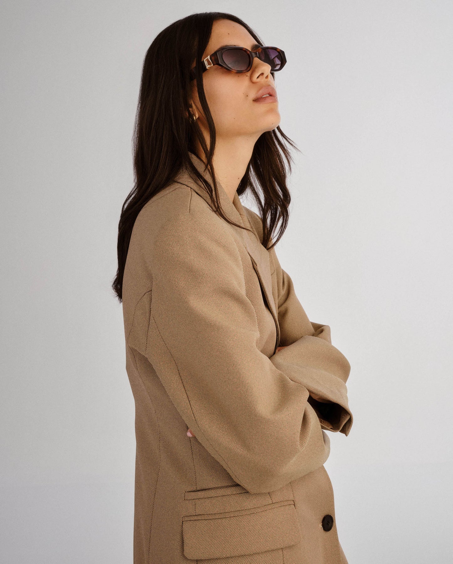 A statement silhouette for the modern muse. The Freddie reimagines the classic frame with a soft hexagonal shape and bevelled edges that catch the light from every angle. Bespoke organic L gold detailing at the temples adds a touch of polish, making this style feel both directional and refined.