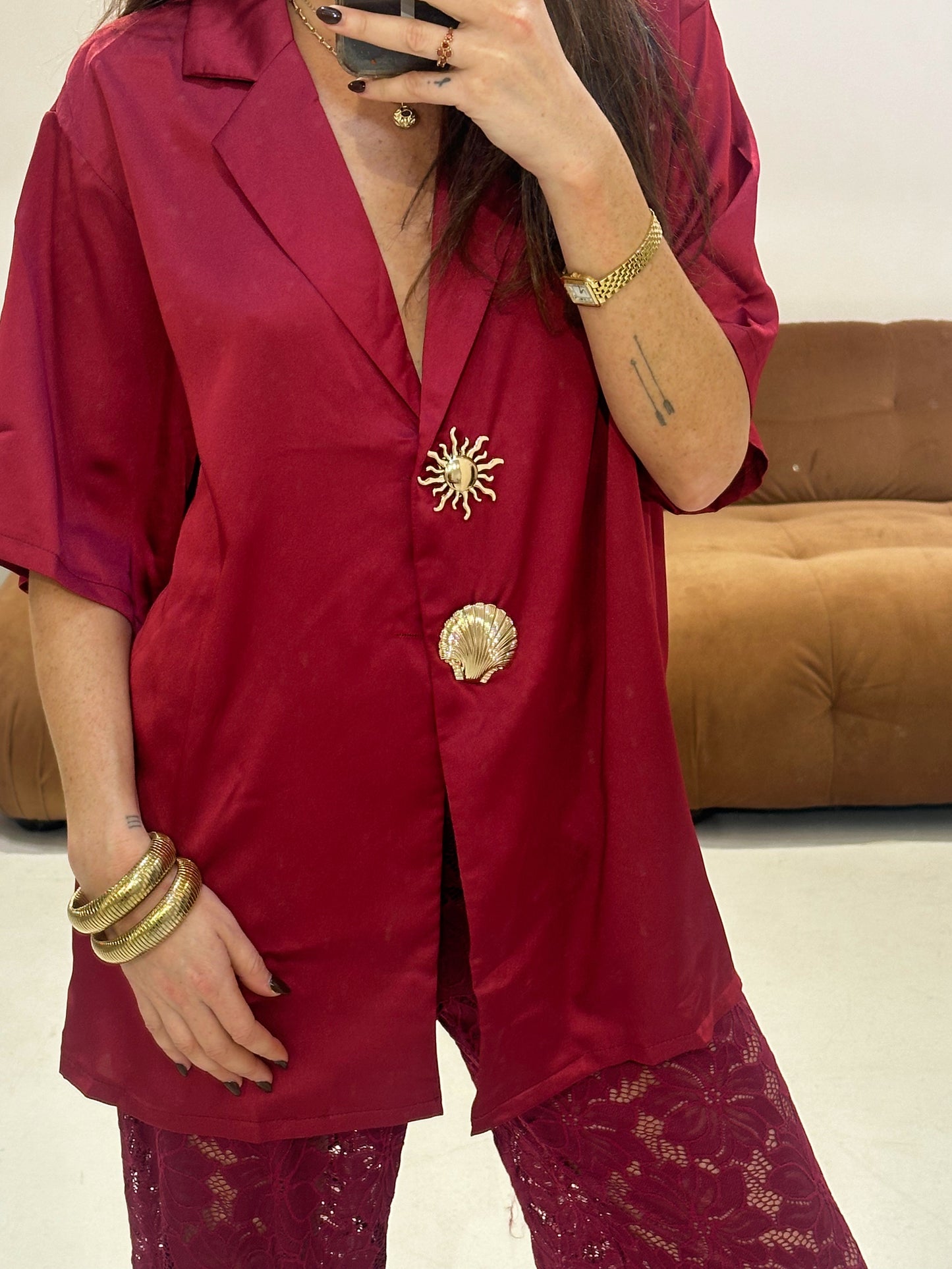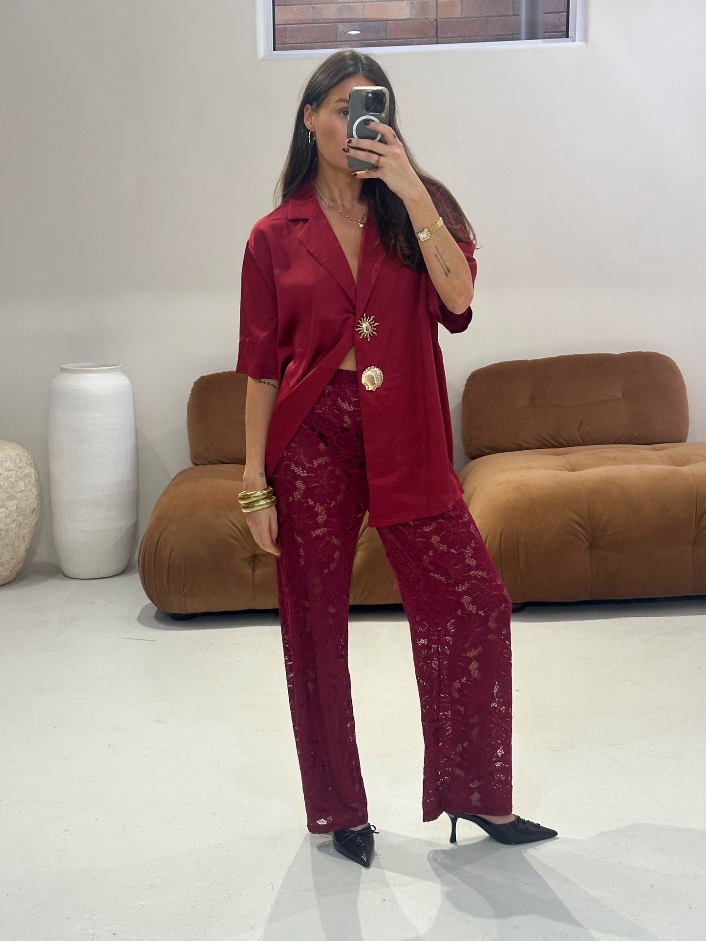 Elastic Waist lace pant and oversized satin shirt with gold button details